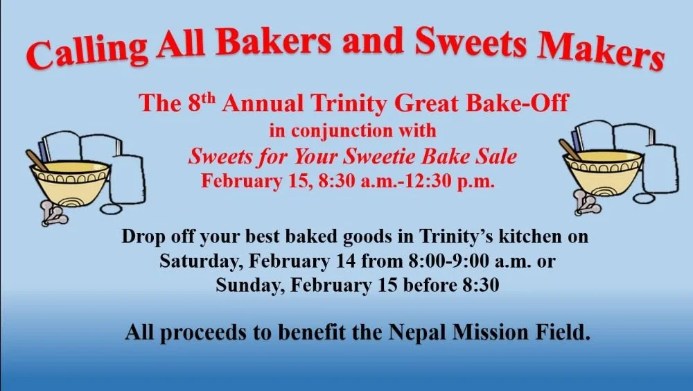 If you have the best ever recipe for any type of baked goods (pies, bread, cookies, candy, cake, bars, etc.), and would like to glorify God and support His mission work, donate your baked masterpieces for the bake sale February 15.